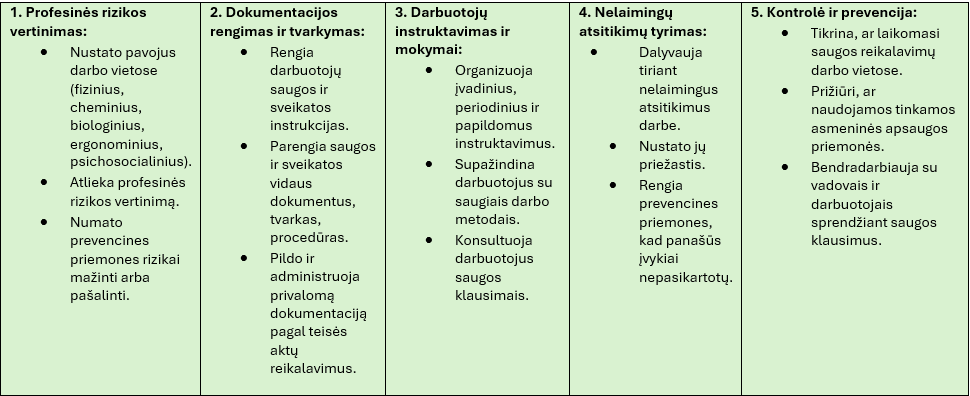 Pagrindinės darbuotojų saugos ir sveikatos specialisto funkcijos ir atsakomybės:
